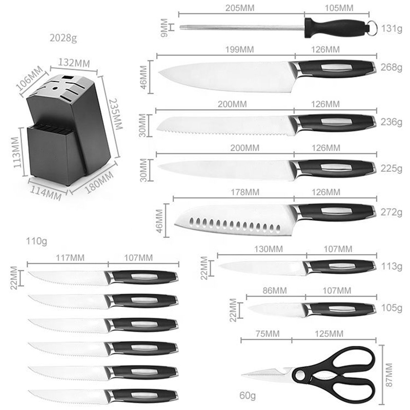 Model Number: KF073 Number of Pieces: 14Pcs Blade Material: 3cr13,4cr13,5cr15mov,7cr17mov,9cr18mov,or customized Handle Material: 430 Stainless Steel + ABS Blade Length: 3.5-8in Packaging: Gift box, Color box or based on client's requirement Logo: Accept Customized logo Brand Name: Koey OEM/ODM: Highly Welcomed Sample time: 5-7days FOB Port:Shenzhen/Guangzhou