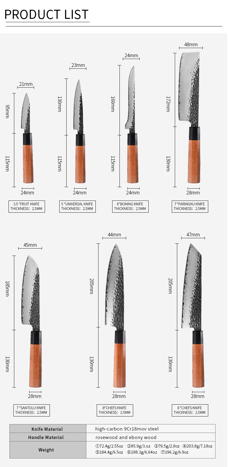 | 7" Santoku Knife | Blade size: 182*44*2.8mm Whole size: 312mm Weight: 184g | 9Cr18MOV stainless steel | 2.8mm | Ebony + rosewood | Natural wood color |