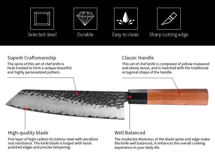 | 8" Chef Knife | Blade size: 203*44*2.7mm Whole size: 332mm Weight: 188g | 9Cr18MOV stainless steel | 2.8mm | Ebony + rosewood | Natural wood color |