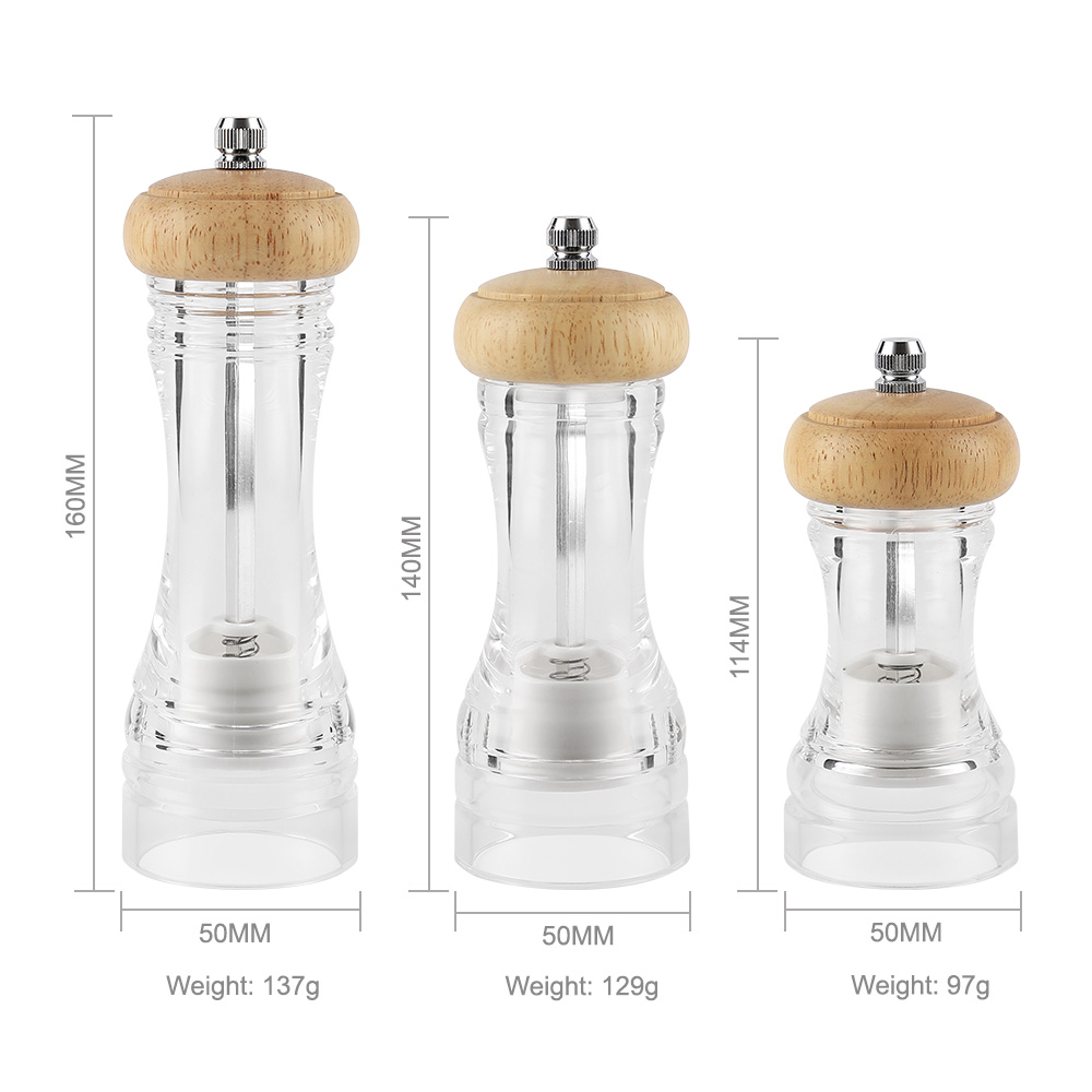 Key Attributes Model Number:SPG076 Number of Pieces: 3pcs Mills Type:Salt & Pepper Mills Material:Wood + Acrylic + Stainless Steel + Aluminum + Ceramic Operation Mode:Rotary Knob Care Instructions:Hand Wash Only Use Way:Manual Packaging: Gift box or as client's requirement Logo: Accept Customized logo Brand Name: Koey OEM/ODM: Highly Welcomed Sample Time: 5-7days FOB Port:Shenzhen/Guangzhou