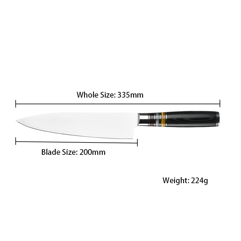 Key Attributes Model Number: KF038C Number of Pieces: 1pc Blade Material: 5CR15MOV Stainless Steel Handle Material: 430 Stainless Steel + Pakka Wood Handle Blade Length: 8in Packaging: Gift box or based on client's requirement Logo: Accept Customized logo Brand Name: Koey OEM/ODM: Highly Welcomed Sample time: 5-7days FOB Port:Shenzhen/Guangzhou