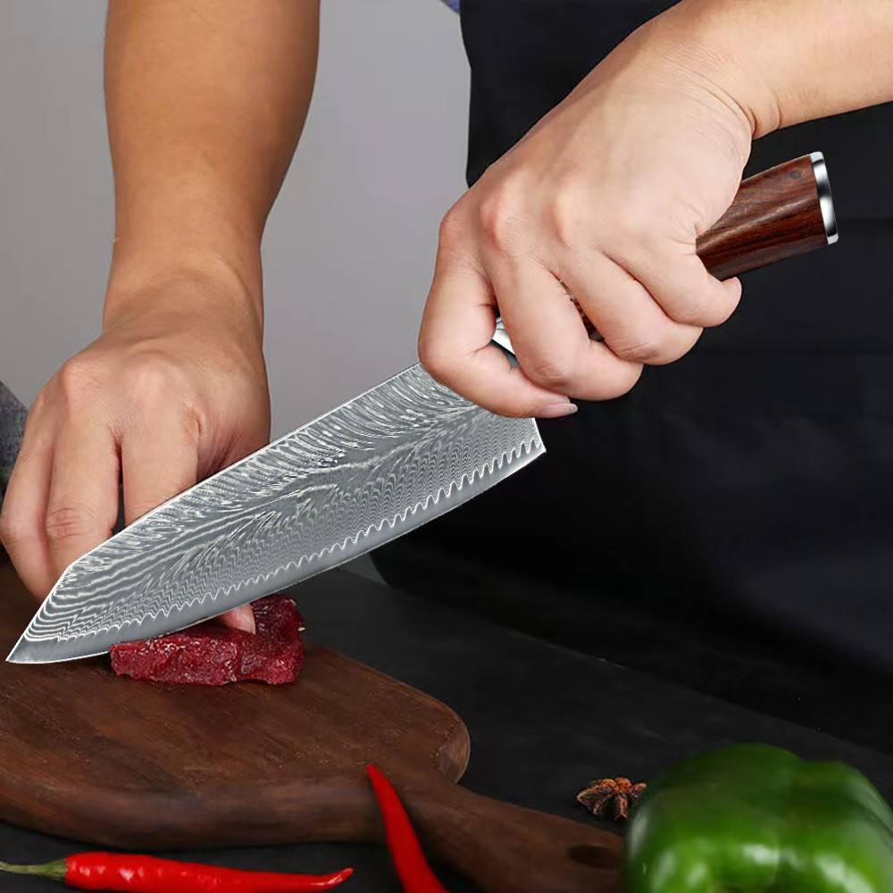 Key Attributes: Model Number: KF023C Number of Pieces: 1pc Blade Material: 67 layers VG-10; Blade Hardness: 58-62 HRC Handle Material: Solid Wood Blade Length: 8in Packaging: Gift box, Color box or based on client's requirement Logo: Accept Customized logo Brand Name: Koey OEM/ODM: Highly Welcomed Sample time: 5-7days FOB Port:Shenzhen/Guangzhou