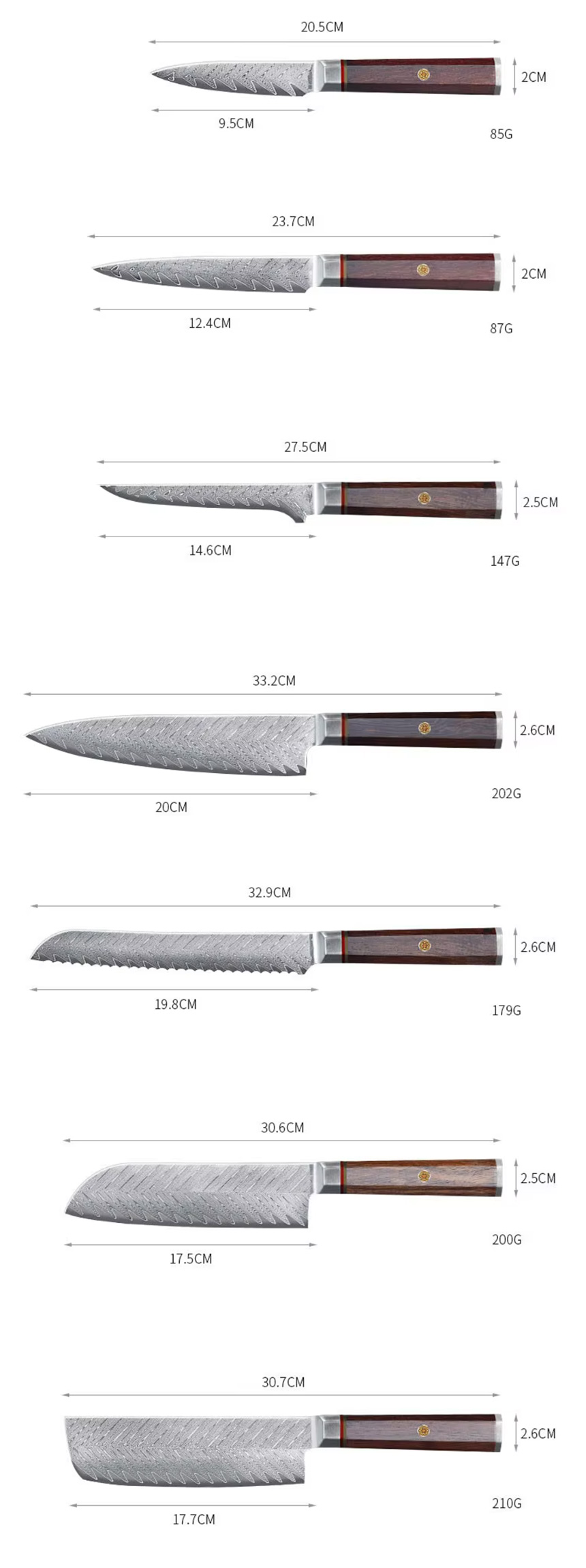 Key Attributes: Model Number: KF018 Number of Pieces: 7Pcs Blade Material: 67 layers VG-10; Blade Hardness: 58-62 HRC Handle Material: Rose Wood Blade Length: 3.5-8in Packaging: Gift box, Color box or based on client's requirement Logo: Accept Customized logo Brand Name: Koey OEM/ODM: Highly Welcomed Sample time: 5-7days FOB Port:Shenzhen/Guangzhou