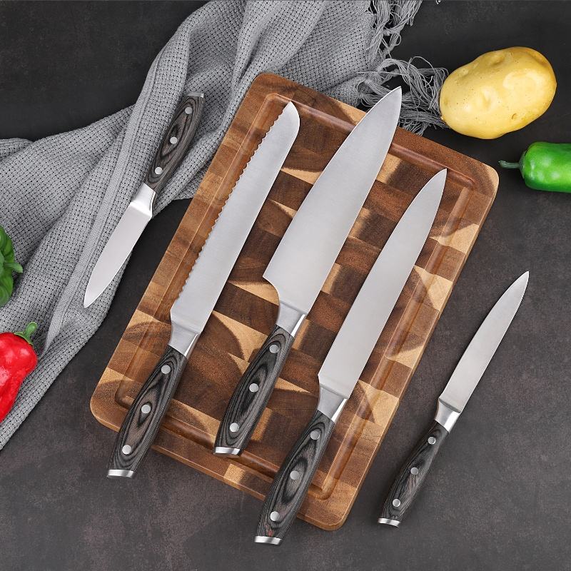 Model Number: KF072 Number of Pieces: 5Pcs Blade Material: 3cr13,4cr13,5cr15mov,7cr17mov,9cr18mov,or customized Handle Material: 430 Stainless Steel + Pakka Wood Blade Length: 3.5-8in Packaging: Gift box, Color box or based on client's requirement Logo: Accept Customized logo Brand Name: Koey OEM/ODM: Highly Welcomed Sample time: 5-7days FOB Port:Shenzhen/Guangzhou