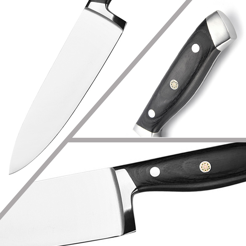 | 8" Chef knife | blade size: 200*50*2.5mm whole size: 335mm weight: 267g | German steel 1.4116 | 2.5mm | Pakka wood +430s/s | Black |