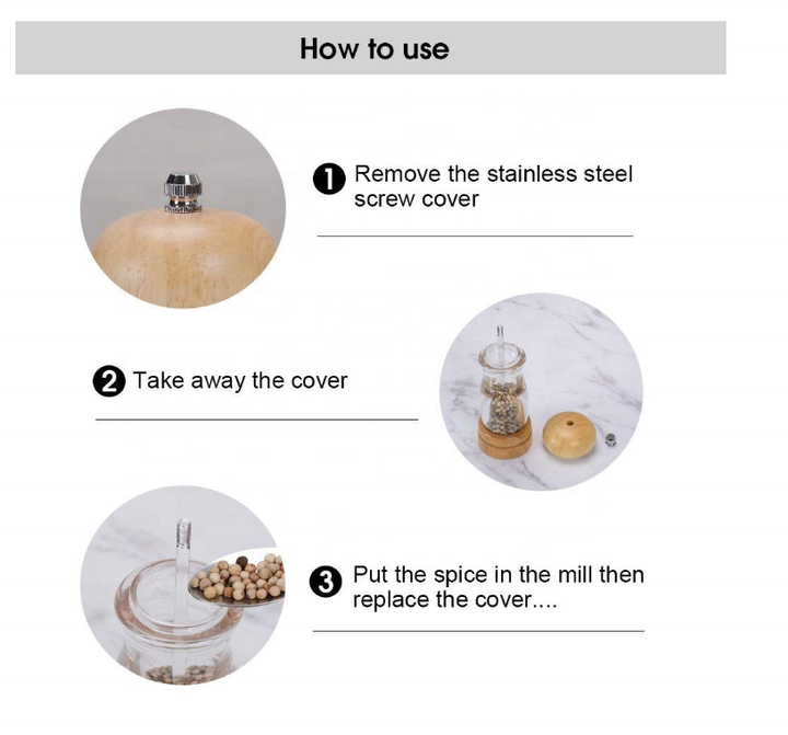 Key Attributes Model Number:SPG076 Number of Pieces: 3pcs Mills Type:Salt & Pepper Mills Material:Wood + Acrylic + Stainless Steel + Aluminum + Ceramic Operation Mode:Rotary Knob Care Instructions:Hand Wash Only Use Way:Manual Packaging: Gift box or as client's requirement Logo: Accept Customized logo Brand Name: Koey OEM/ODM: Highly Welcomed Sample Time: 5-7days FOB Port:Shenzhen/Guangzhou