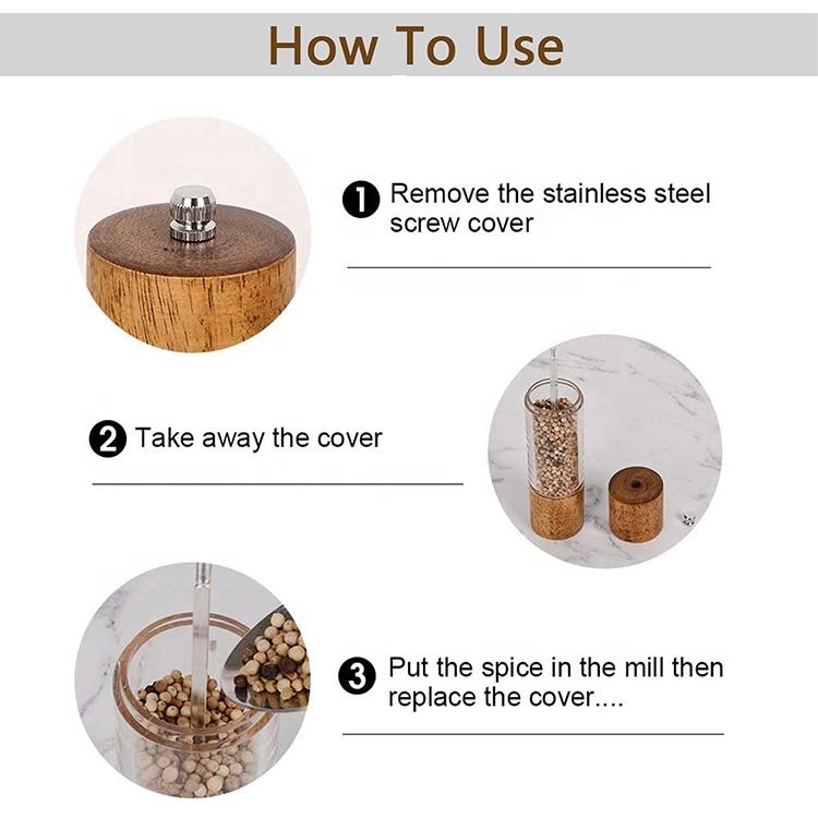 Key Attributes Model Number:SPG076 Number of Pieces: 3pcs Mills Type:Salt & Pepper Mills Material:Wood + Acrylic + Stainless Steel + Aluminum + Ceramic Operation Mode:Rotary Knob Care Instructions:Hand Wash Only Use Way:Manual Packaging: Gift box or as client's requirement Logo: Accept Customized logo Brand Name: Koey OEM/ODM: Highly Welcomed Sample Time: 5-7days FOB Port:Shenzhen/Guangzhou