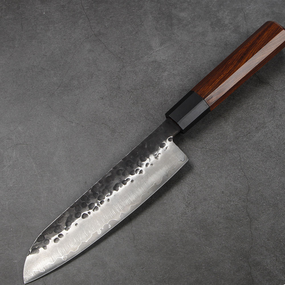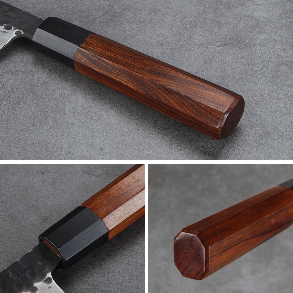| 8" Gyuto knife | Blade size: 182*44*2.8mm Whole size: 312mm Weight: 210g | 9Cr18MOV stainless steel | 2.8mm | Ebony + rosewood | Natural wood color |
