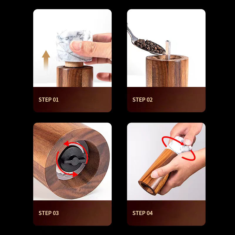 Key Attributes Model Number:SPG072 Number of Pieces: 2pcs Mills Type:Salt & Pepper Mills Material:Acacia Wood Operation Mode:Rotary Knob Care Instructions:Hand Wash Only Use Way:Manual Packaging: Gift box or as client's requirement Logo: Accept Customized logo Brand Name: Koey OEM/ODM: Highly Welcomed Sample Time: 5-7days FOB Port:Shenzhen/Guangzhou