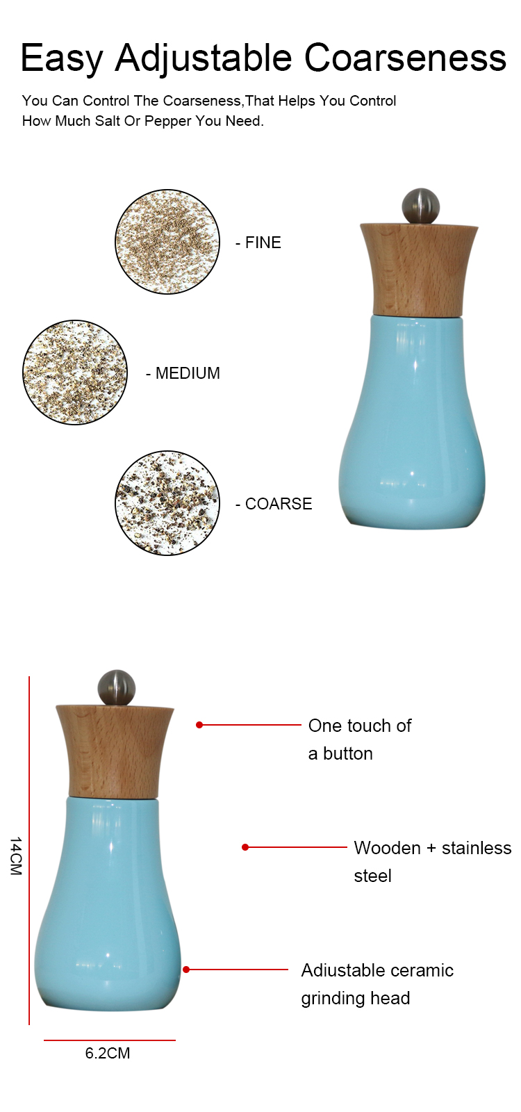 Key Attributes Model Number:SPG040 Number of Pieces: 1pc Mills Type:Salt & Pepper Mills Material:Rubber wood + Wood Candy Color Painting Operation Mode:Rotary Knob Care Instructions:Hand Wash Only Use Way:Manual Packaging: Gift box or as client's requirement Logo: Accept Customized logo Brand Name: Koey OEM/ODM: Highly Welcomed Sample Time: 5-7days FOB Port:Shenzhen/Guangzhou