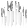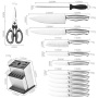 | Set Includes | 8 inch Chef knife * 1pc 8 inch Carving knife * 1pc 5 inch Bread knife * 1pc 5 inch Santoku knife * 1pc 5 inch Utility knife * 1pc 4.5 inch Steak knife * 6pcs 3.5 inch Paring knife * 1pc Sharpener * 1pc Scissor * 1pc |